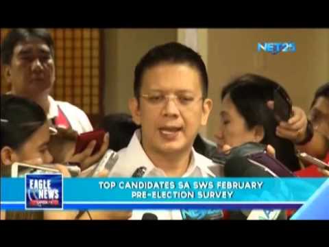MANILA, Philippines – In the latest pre-election survey conducted by the Social Weather Station, Vice-President Jejomar Binay led with 29% while Senator Bongbong Marcos and Senator Chiz Escudero lead among the vice-presidential candidates with 26%. (Eagle News Service Described by Jay Paul Carlos, Video Editing by Jericho Morales, Uploaded by MRFaith Bonalos)