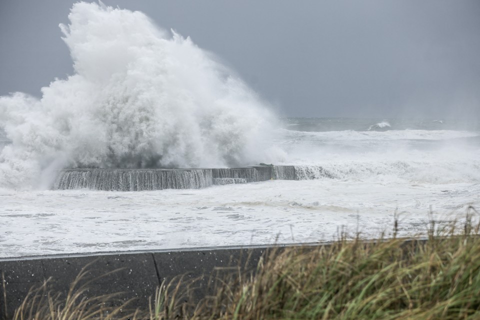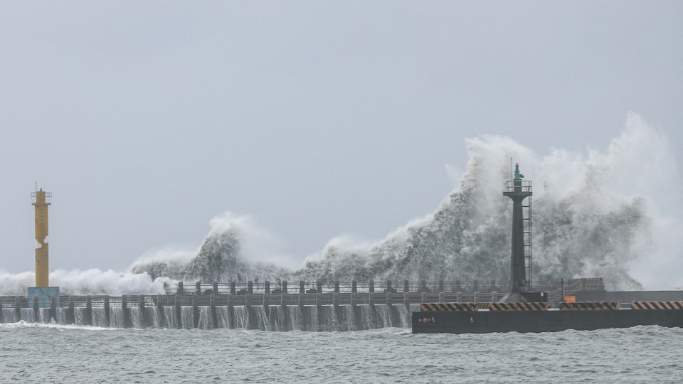 Massive waves crashed against the coast of northeastern Yilan county and, in the capital Taipei, shops and government offices were closed.