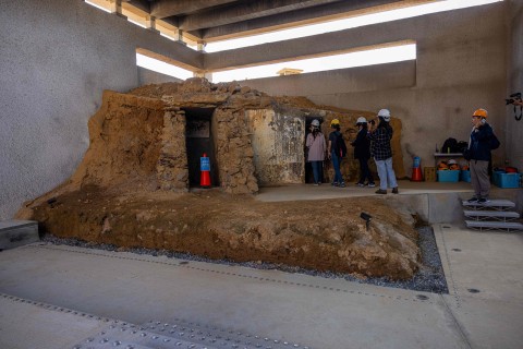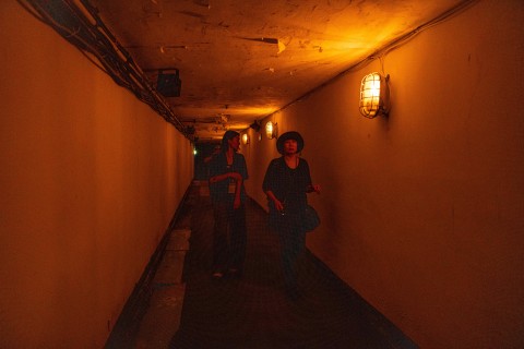 Visitors enter a tunnel at Stronghold 26, a former military fortification now turned tourist attraction currently exhibiting artworks as part of the Matsu Biennial art exhibition, on Nangan island in Taiwan’s Matsu Islands on October 12, 2023. A former military power plant on Taiwan’s tiny Matsu archipelago is bathed in an ominous crimson light — an art installation reminding visitors of the ever-present threat of a Chinese invasion. (Photo by Annabelle CHIH / AFP) / TO GO WITH Taiwan-China-politics-military-arts,FOCUS by Sean CHANG