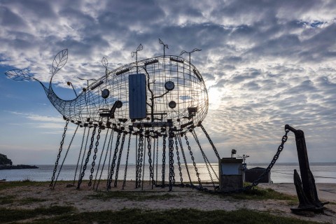 A whale-shaped wire structure is erected on a beach, fashioned out of old Matsu ships with navy vessel accents.