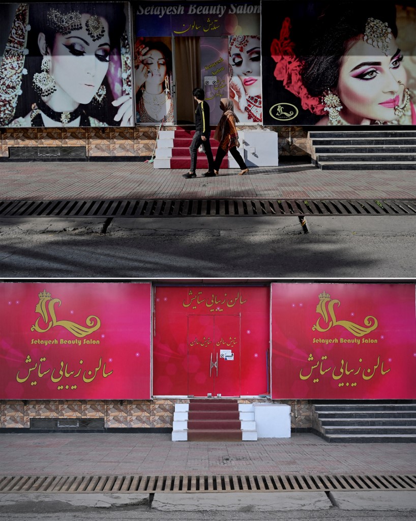 (COMBO) This combination of pictures created on January 23, 2022 shows a couple walking past images of women outside a beauty parlour in Kabul on June 10, 2021; and (bottom) the same view with the images of women removed on January 20, 2022, following the Taliban’s takeover of the country on August 15, 2021. – The Taliban stunned the world by marching into the Afghan capital on August 15, 2021, after a lightning offensive that capped a 20-year insurgency against the Western-backed government and the US and allied forces that propped it up. (Photo by Mohd RASFAN and Adek BERRY / AFP)