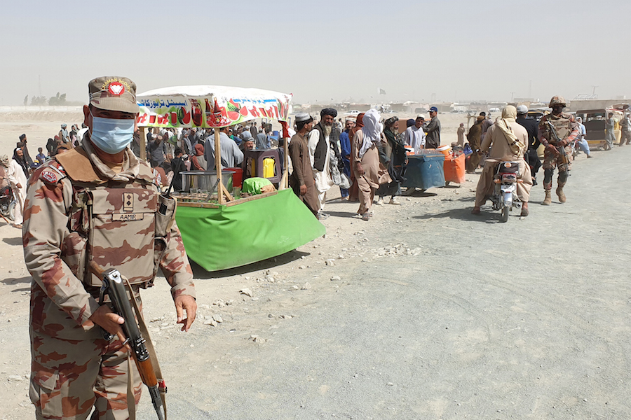 An army soldier patrols as stranded people wait for the reopening of the border crossing point which was closed by the authorities, in Chaman on August 7, 2021, after the Taliban took control of the Afghan border town in a rapid offensive across the country. (Photo by Asghar ACHAKZAI / AFP)