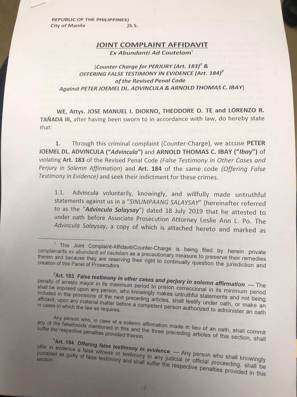 “By executing these documents (Advincula affidavit and Ibay complaint) under oath and thereafter submitting them to the (Department of Justice) as evidence, Ibay and Advincula committed (the crimes of perjury and offering false testimony in evidence),” they added.