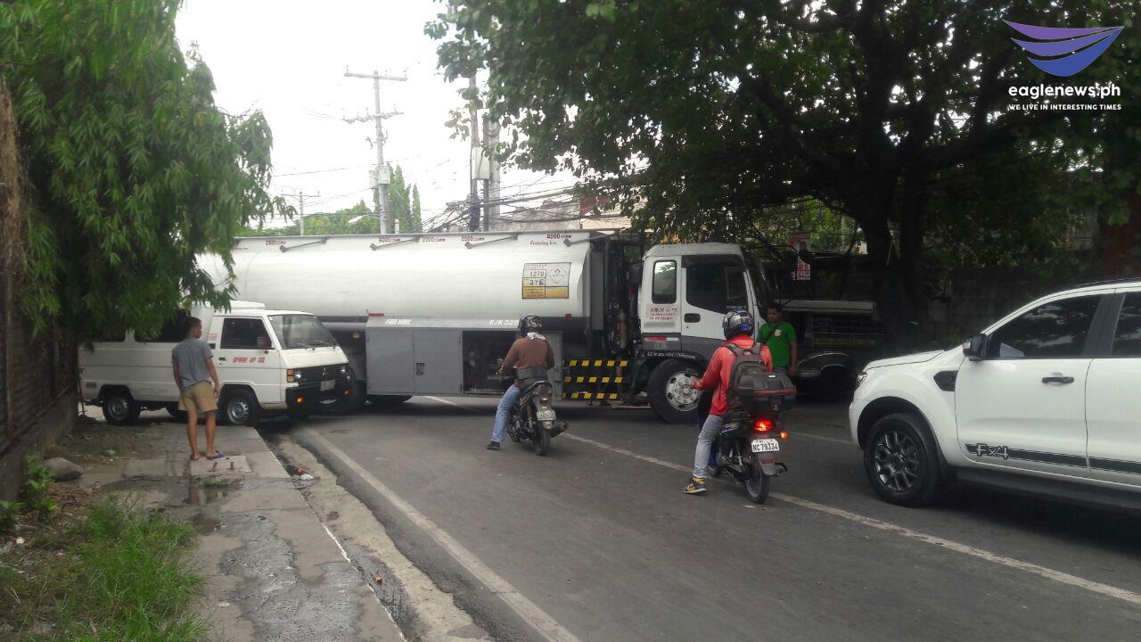 Ang tanker truck na may plakang RJK 329 ay humarang sa mga sasakyang palabas ng Mindanao Ave. at papasok naman sa Tandang Sora Ave.