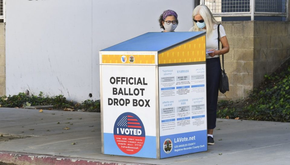 Voters cast their ballots for the 2020 US Elections at an offical ballot drop box on a sidewalk in Los Angeles, California on October 12, 2020, where election officials are looking into the use of unofficial ballot drop boxes installed by California’s Republican Party. (Photo by Frederic J. BROWN / AFP)