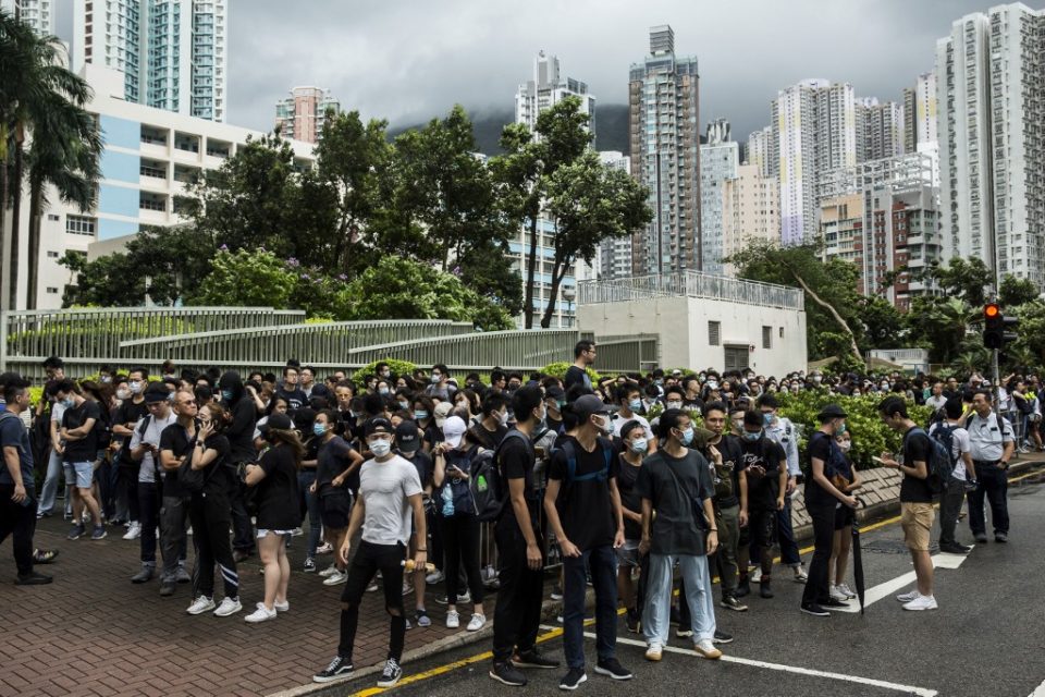 Demonstrators gather outside the Eastern district court in Hong Kong on July 31, 2019, in support of protesters who have been charged with rioting during recent clashes with police. – Dozens of pro-democracy protesters in Hong Kong arrived in court on July 31 after being charged with rioting, setting the stage for further unrest in a weeks-long crisis that has rocked the global financial hub. (Photo by ISAAC LAWRENCE / AFP)