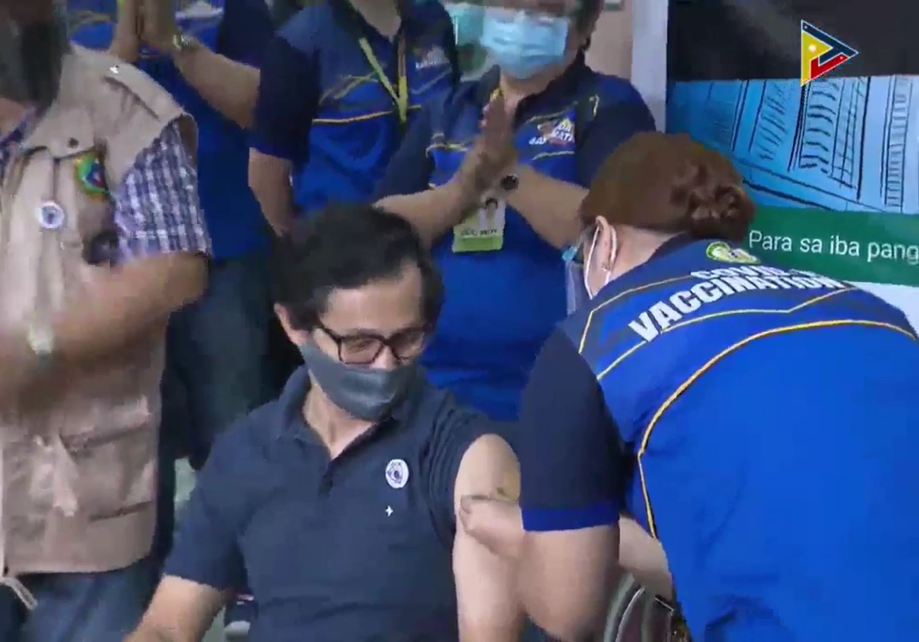 Galvez got his Sinovac shot shortly after 12 noon at the PGH. He gave the thumbs up sign as he was being vaccinated.