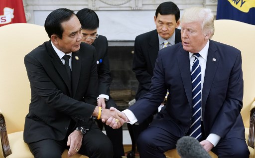 US President Donald Trump and Thailand’s Prime Minister Prayut Chan-o-cha shake hands as they take part in a meeting in the Oval Office of the White House on October 2, 2017 in Washington, DC. / AFP / Mandel Ngan/