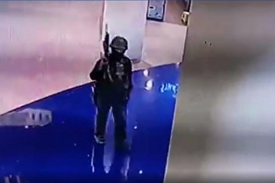 A video grab created on February 9, 2020 from a handout video released by the MCOT Thai Public Company Limited on February 8, 2020 shows CCTV footage of Thai soldier Jakrapanth Thomma holding a gun as he walks through the Terminal 21 shopping mall in Nakhon Ratchasima. – A Thai soldier who killed at least 20 people and holed up in a mall overnight was shot dead by commandos on February 9, ending a near-17-hour ordeal which left dozens wounded and stunned the country. (Photo by MCOT / MCOT Public Company Limited / AFP)