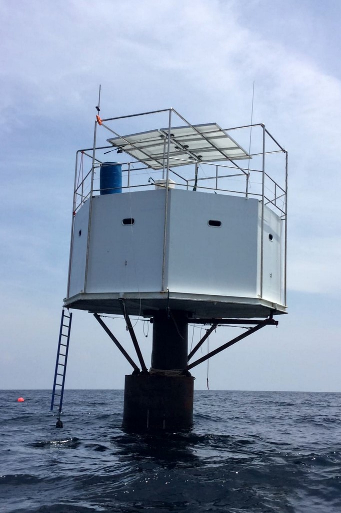 The top of the platform served as a deck, which was covered with solar panels, and the whole thing was mounted on a 2-metre-long floating steel “spar” which is anchored to the ocean’s floor.