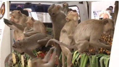 LOPBURI, THAILAND (Reuters) — A province in Thailand famous for its monkey population laid out an annual fruit buffet on Sunday (November 27) to thank them for bringing in tourists and helping the local economy.