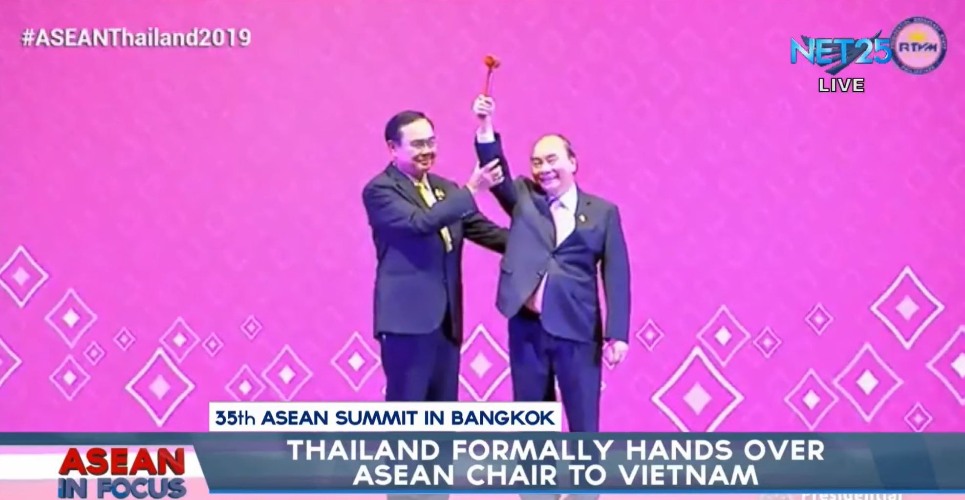 Thai Prime Minister Prayut Chan-o-cha turned over the symbolic gavel of the ASEAN chairmanship to Vietnamese Prime Minster Nguyễn Xuân Phúc.