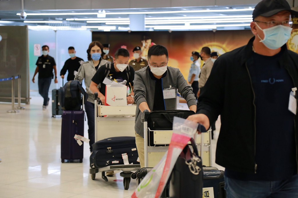 A planeload of 39 Chinese tourists flew into Bangkok’s Suvarnabhumi Airport Tuesday evening from Shanghai to a welcome from staff in full protective equipment.