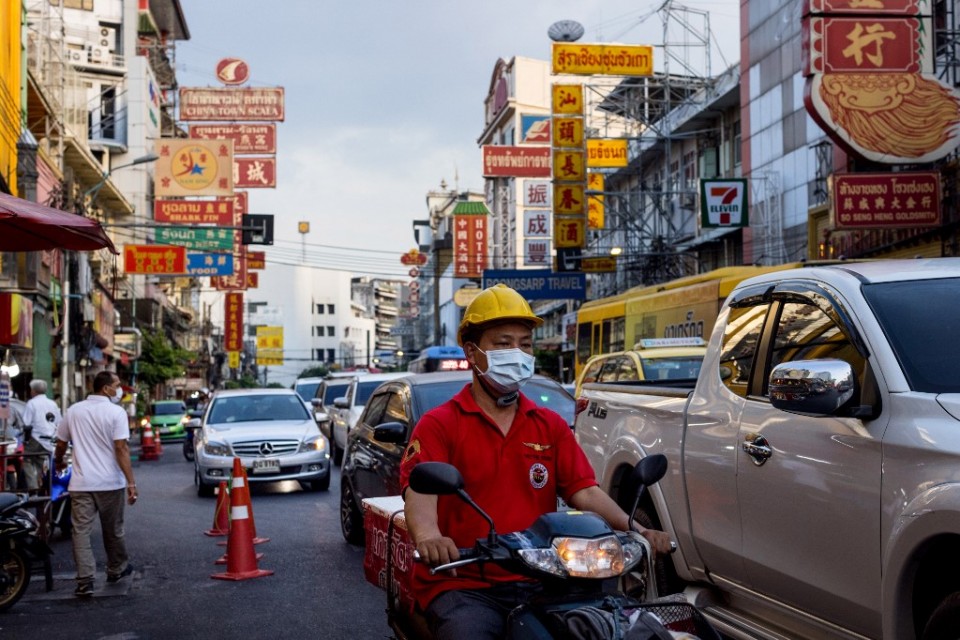 A man wearing a hard hat and face mask rides a moped through the Chinatown area of Bangkok on January 4, 2022. (Photo by Jack TAYLOR / AFP)