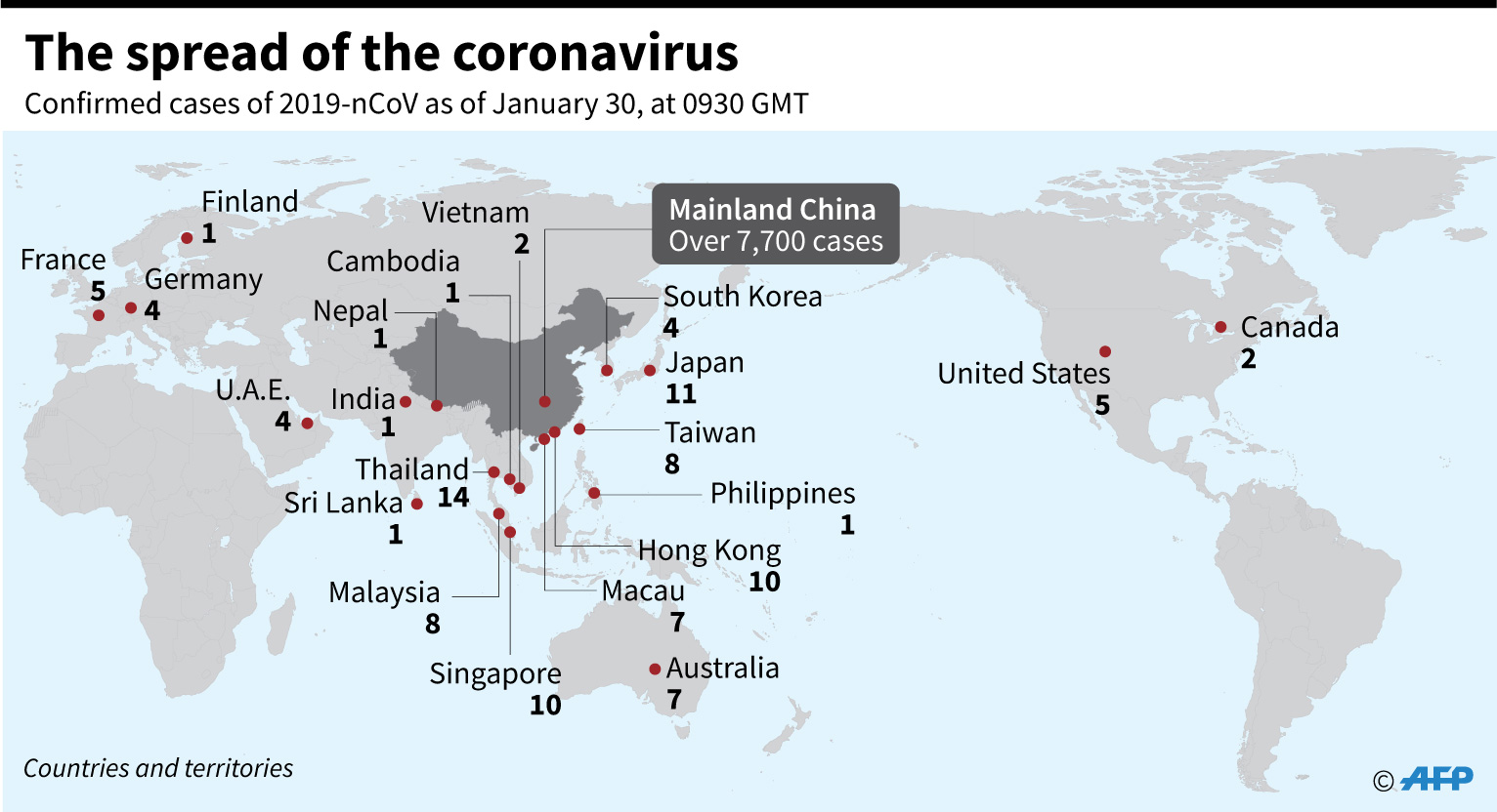 As of Thursday, around 7,700 people have been infected across China, the majority in and around Wuhan.