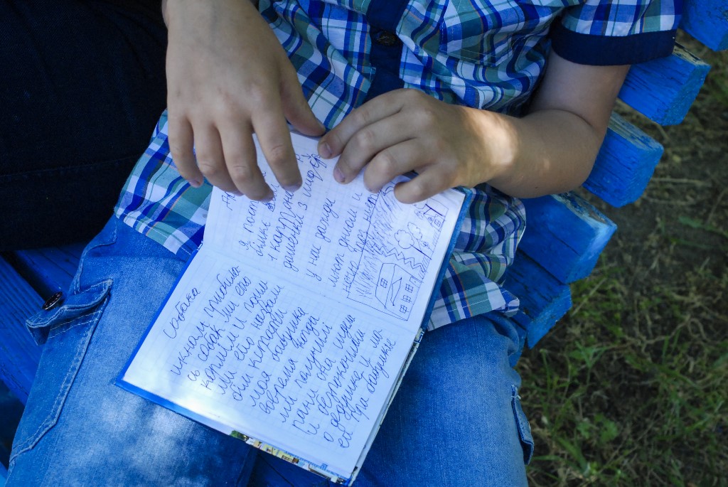 “I have a wound on my back, the skin is ripped off. My sister’s head is broken, my mum tore her hand muscles and has a hole in the leg,” Yegor reads from another entry.