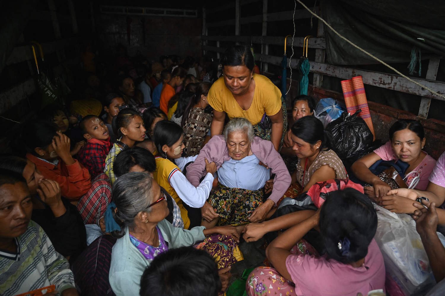 “We have our grandma in our family and we have to take care of her,” Khine Min told AFP from a truck packed with his relatives on a road out of the state capital.