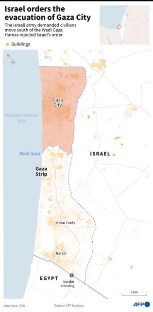 AFP correspondents in Gaza said the Israeli military on Friday dropped flyers warning residents to flee “immediately” south of Wadi Gaza, with a map pointing south across a line in the centre of the 40 kilometre-long (25 mile-long) territory.