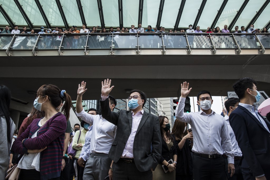 On Friday a “Lunch With You” event saw thousands of mainly office workers take to the city’s streets, many chanting “Stand with Hong Kong” and raising an open hand with five fingers splayed.