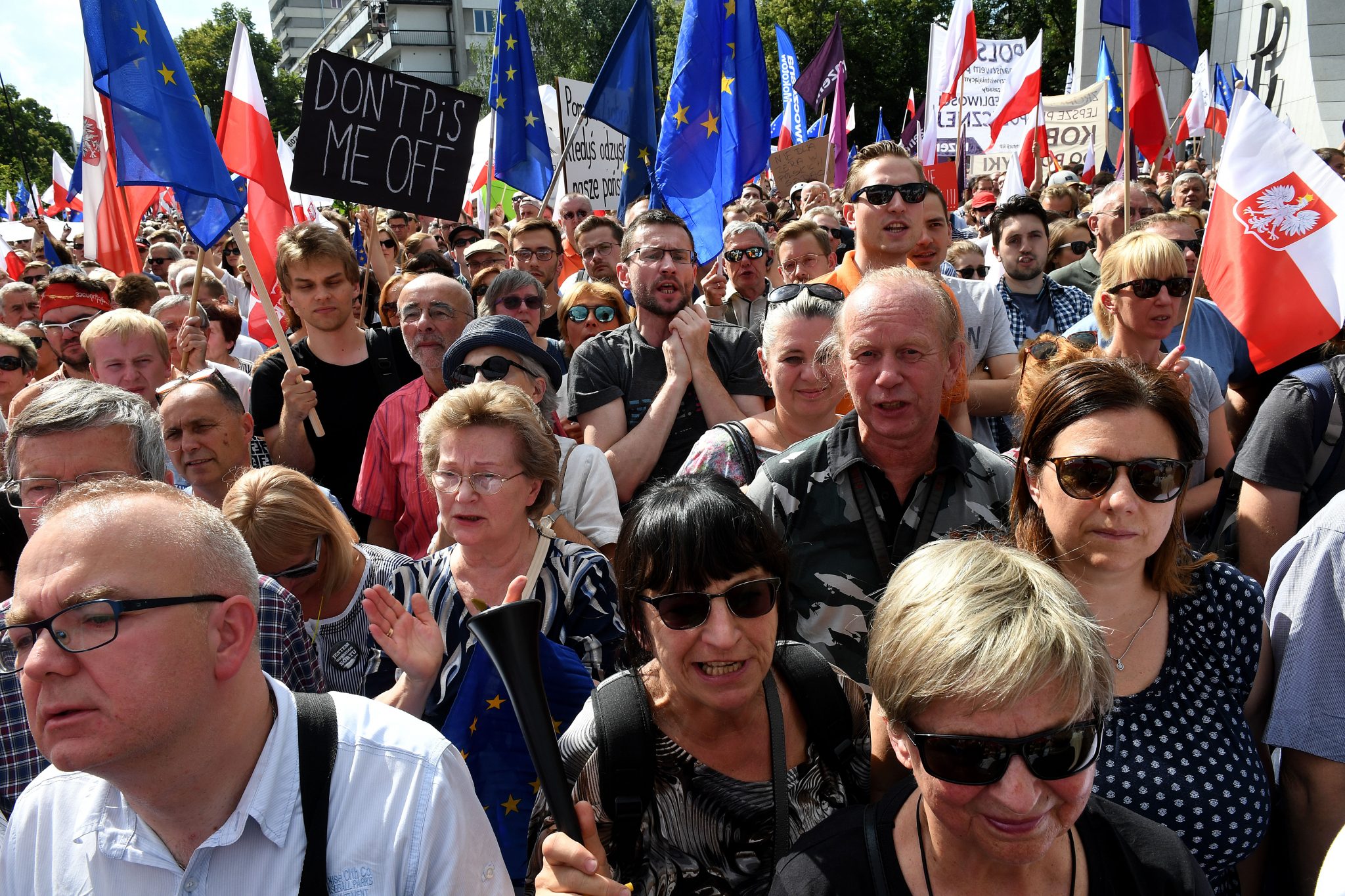 Protesters waved European Union and Polish flags and shouted “we will defend democracy” at an afternoon demonstration in front of the parliament, which this week passed legislation that critics say gives the ruling Law and Justice (PiS) party power over the courts.