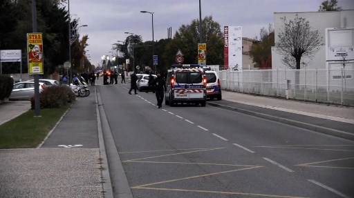 An image grab from an AFP TV video shows police vehicles in a street where a man “deliberately” rammed his car into three Chinese students in Blagnac near the southern French city of Toulouse on November 10, 2017, injuring one of them seriously, said justice officials, who indicated the attack was not linked to terrorism. / AFP PHOTO / Hugues Jeanneau / AFP TV