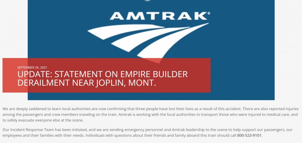 The Empire Builder train derailed in a remote area near Joplin, Montana, a town of around 200 people near the border with Canada.
