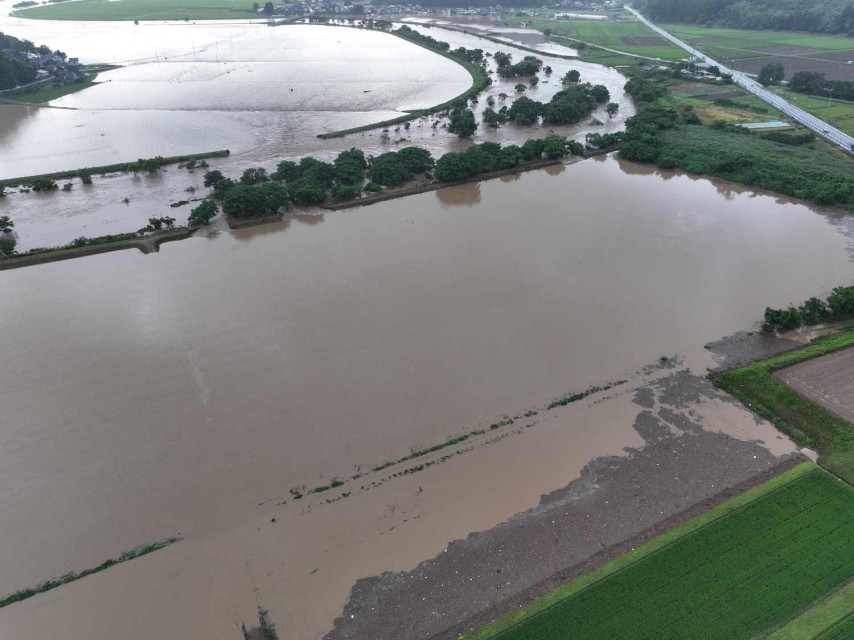 This handout photo taken on July 25, 2024 and released courtesy of the Akita Prefecture River Sabo Division to AFP on July 26, shows flooding along the Ishizawa river, whose embankment collapsed due to heavy rains, in Yurihonjo, Akita prefecture. At least three people were missing in Japan on July 26, after heavy rains caused rivers to burst their banks, washing away cars and prompting several thousand locals to evacuate, authorities and media reports said. Local governments in the northern prefectures of Yamagata and Akita issued evacuation advisories to more than 200,000 people, the fire and disaster management agency said. (Photo by Handout / Akita Prefecture River Sabo Division / AFP)