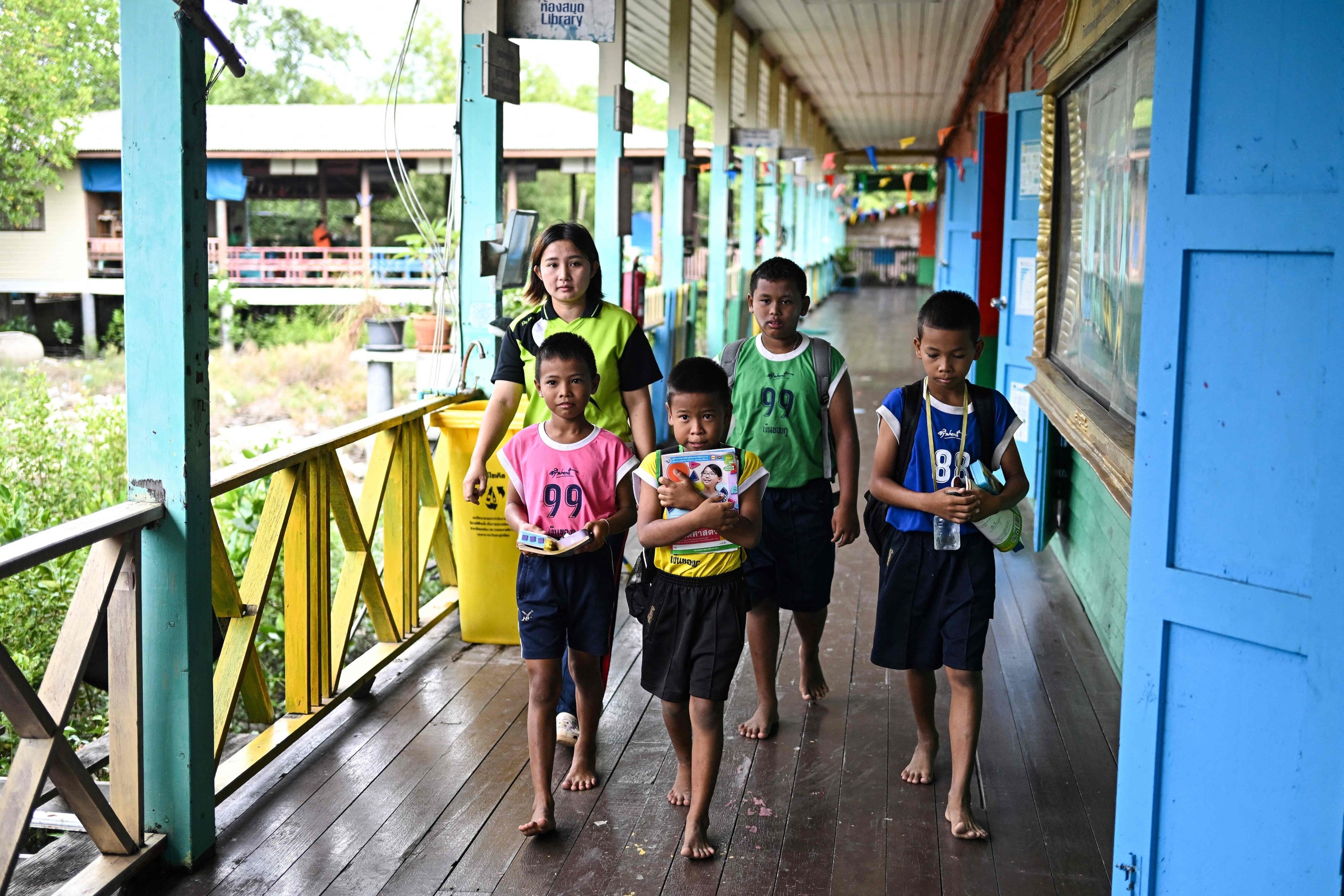 BAN KHUN SAMUT CHIN, Thailand, June 23, 2023 (AFP) – Each morning, four children stand barefoot in a line and proudly sing the national anthem as the Thai flag is raised outside their school, perched on a finger of land surrounded by the sea.