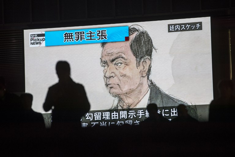 (FILES) In this file photo taken on January 8, 2019, pedestrians walk past a television screen in Tokyo, showing a news programme displaying a sketch of former Nissan chief Carlos Ghosn in the courtroom as the headline reads in Japanese “Innocence claim.” – A Tokyo court on January 22, 2019 rejected a fresh bail request from ex-Nissan chief Carlos Ghosn, despite his pledge to stay in Japan if released before trial on financial misconduct charges. (Photo by Behrouz MEHRI / AFP)