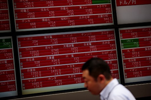Tokyo shares rebounded in the morning on August 15 after four days of losses as fears over a US-North Korea military conflict began to recede. / AFP PHOTO / Behrouz MEHRI