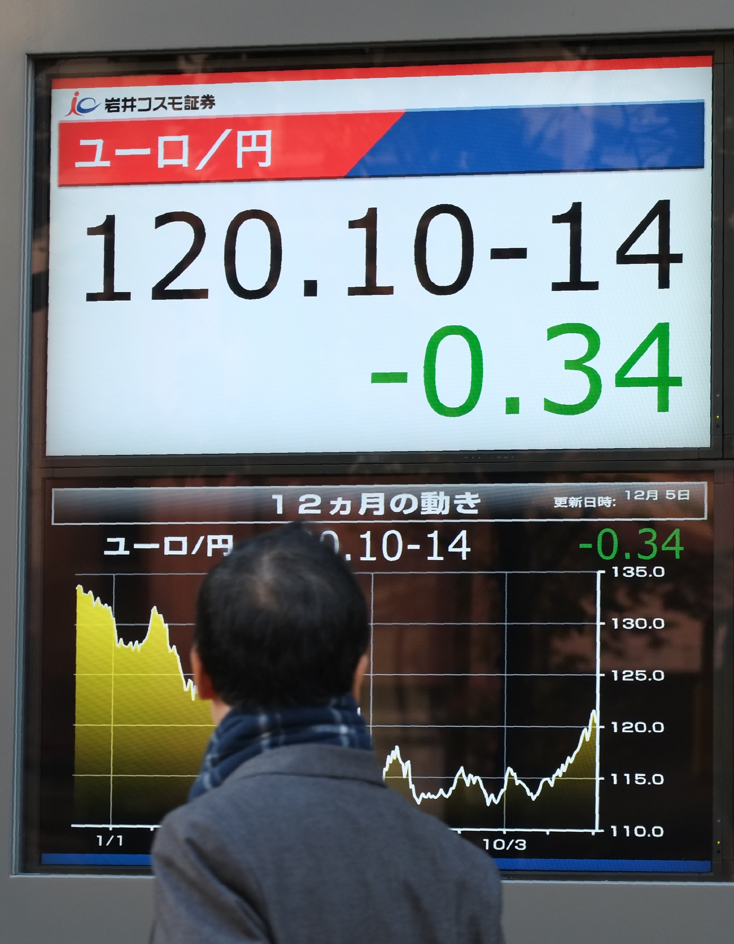 Tokyo stocks opened lower on December 5 after Italian Prime Minister Matteo Renzi’s resignation following a crushing referendum defeat sparked worries about political instability in the key eurozone country. / AFP PHOTO / KAZUHIRO NOGI