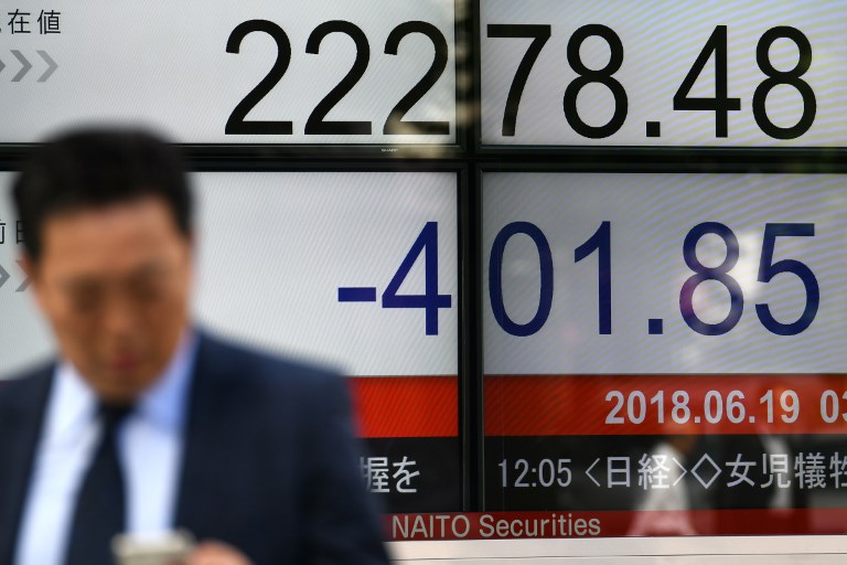 Tokyo’s benchmark Nikkei index dropped more than 1.7 percent on June 19, with investors jittery over US-China trade tensions and a strong yen. / AFP PHOTO / Toshifumi KITAMURA