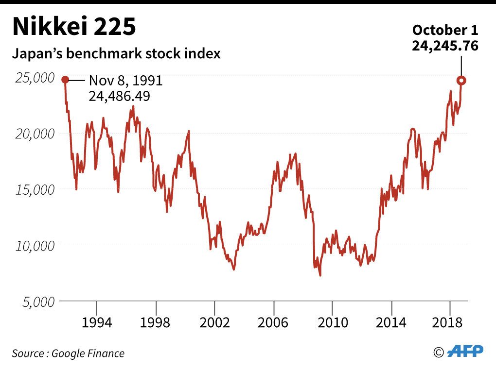 The Nikkei 225 index gained 0.52 percent or 125.72 points to close at 24,245.76 — the highest since November 1991 when Japan Inc was closing the final chapter of the nation’s speculative “bubble” economy.