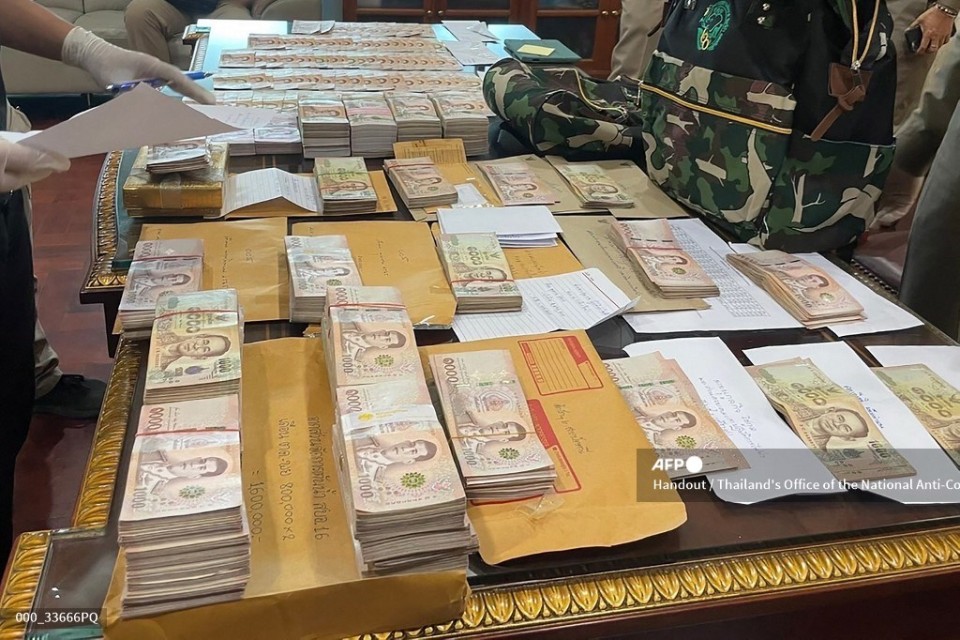 Images shared by Thai police showed stacks of money, with brown envelopes underneath.