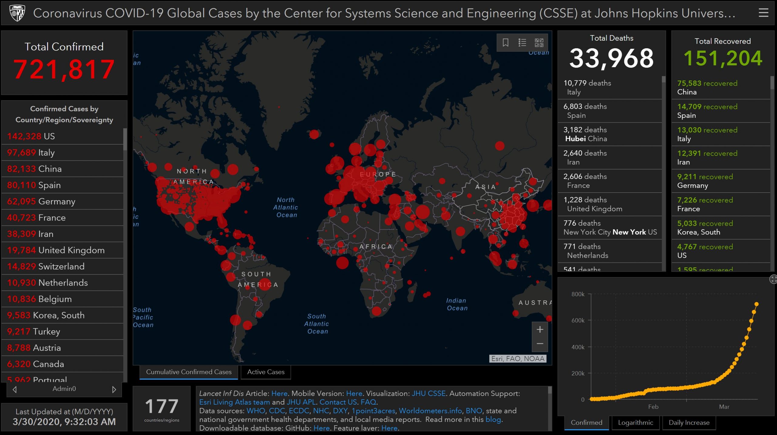 (Eagle News) – The number of confirmed cases of the novel coronavirus (COVID-19) worldwide have reached more than 720,000 with recoveries reported at more than 150,000, according to the latest data from the virus dashboard of Johns Hopkins University tracking global cases of COVID-19.