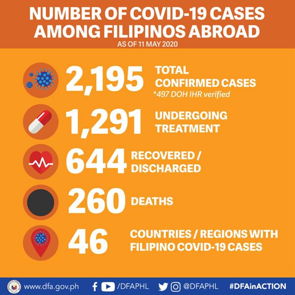 (Eagle News) – The Department of Foreign Affairs (DFA) reported 17 new confirmed COVID-19 cases involving overseas Filipinos, bringing the total number of confirmed cases to 2,195 as of Monday, May 11.