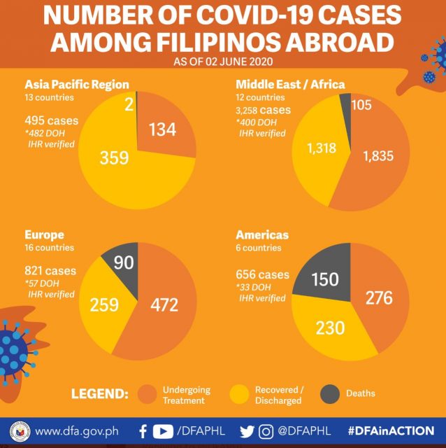 “Middle East and Europe still have the highest number of recorded Filipinos infected with COVID-19, Asia and the Pacific has fewest number of cases and highest in recoveries followed by Europe,” the DFA said.