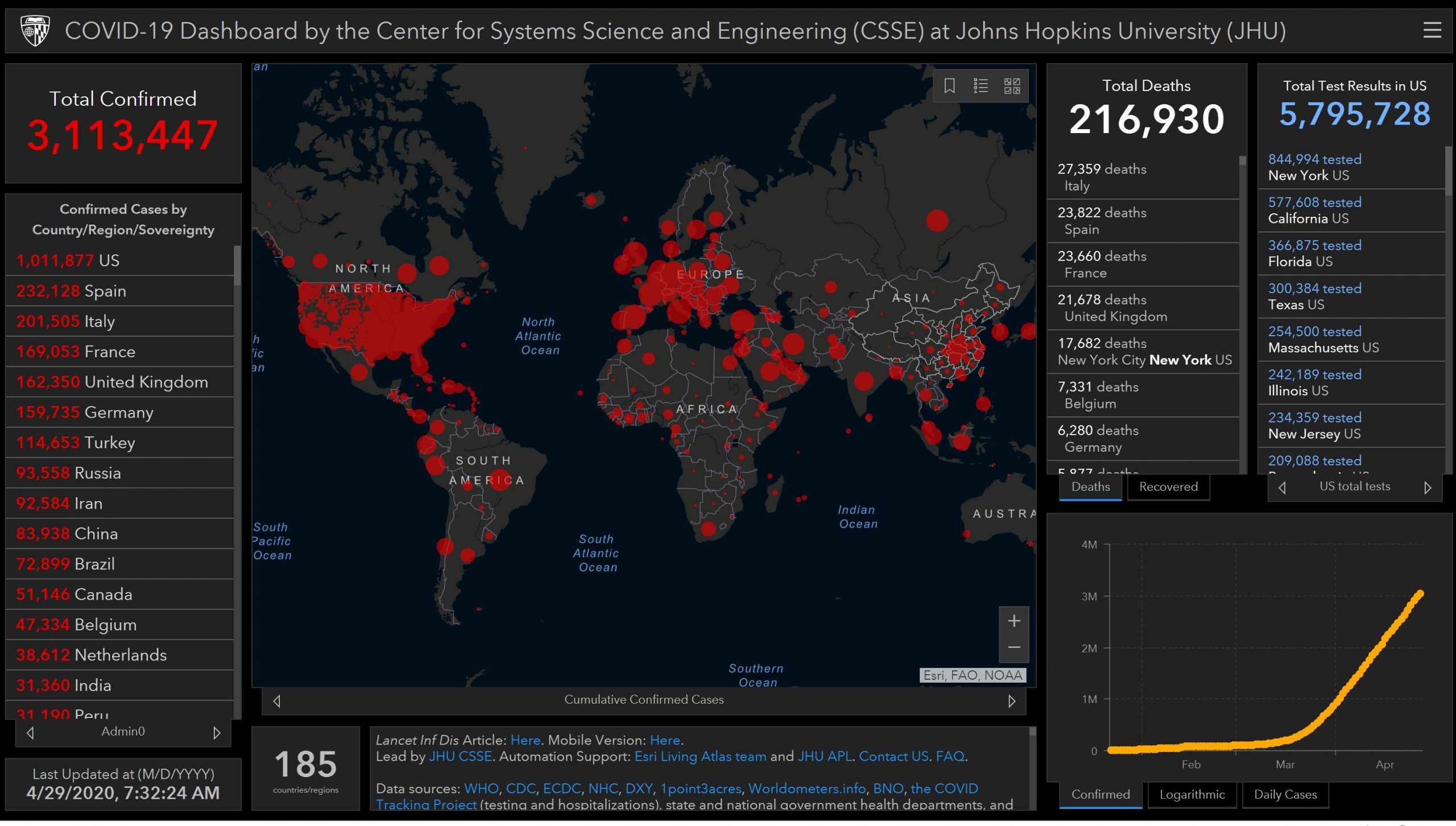 Global virus cases totaled 3,113,447 with 216,930 deaths as of 7:32 a.m. Wednesday, April 29 (Manila time), based on the JHU virus dashboard.