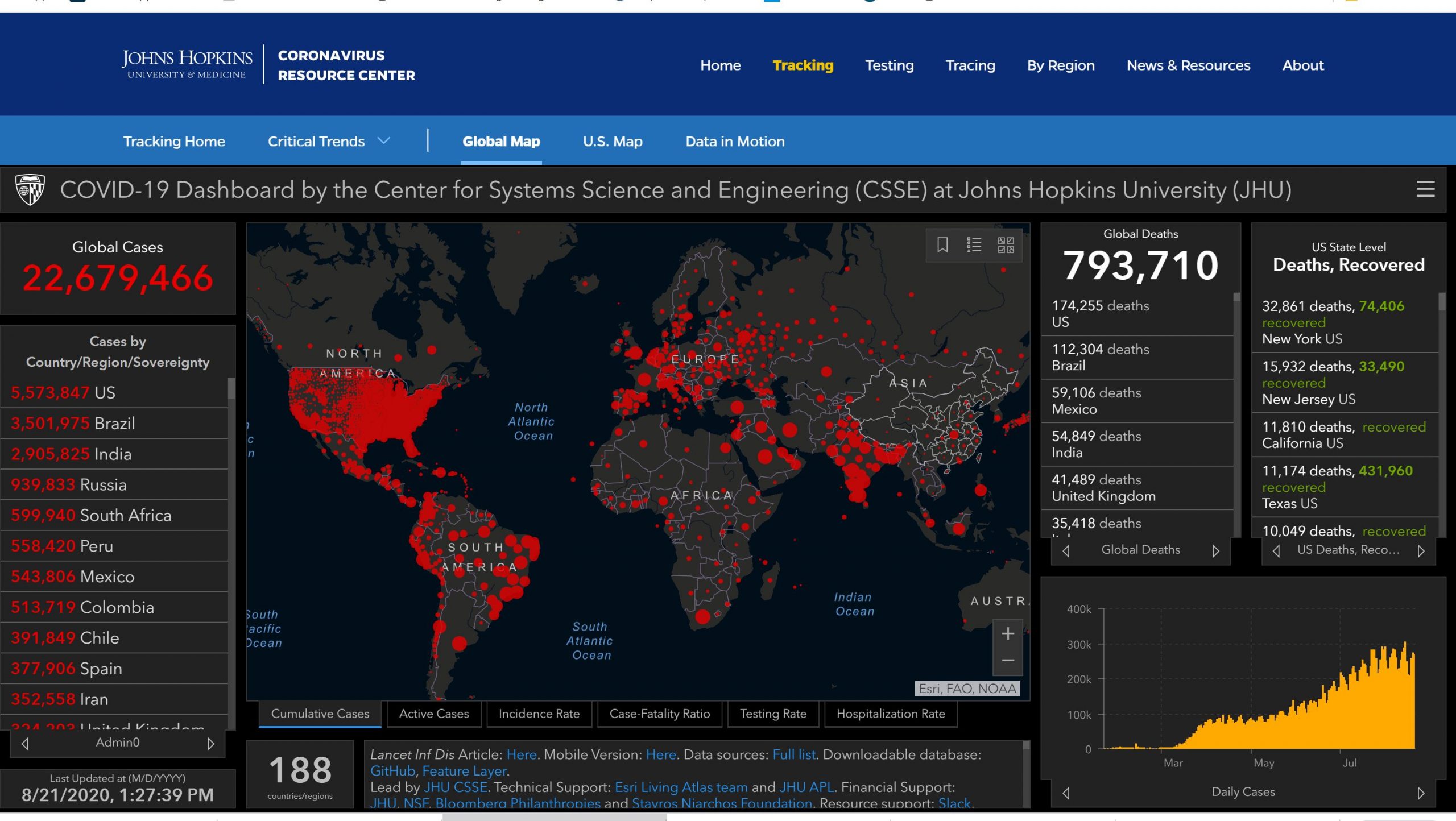 (Eagle News) – Total coronavirus cases worldwide have reached more than 22.6 million while deaths due to the virus have reached more than 793,000, according to the virus dashboard of the Johns Hopkins University.