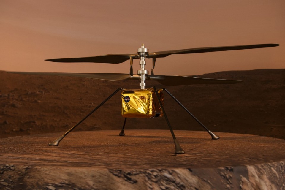A full scale model of the experimental Ingenuity Mars Helicopter, which will be carried under the Mars 2020 Perseverance rover, is displayed at NASA’s Jet Propulsion Laboratory (JPL) on February 16, 2021 in Pasadena, California. – The Mars exploration rover will search for signs of ancient microbial life and collect rock samples for future return to Earth to study the red planet’s geology and climate, paving the way for human exploration. Perseverance also carries the experimental Ingenuity Mars Helicopter – which will attempt the first powered, controlled flight on another planet. (Photo by Patrick T. FALLON / AFP)