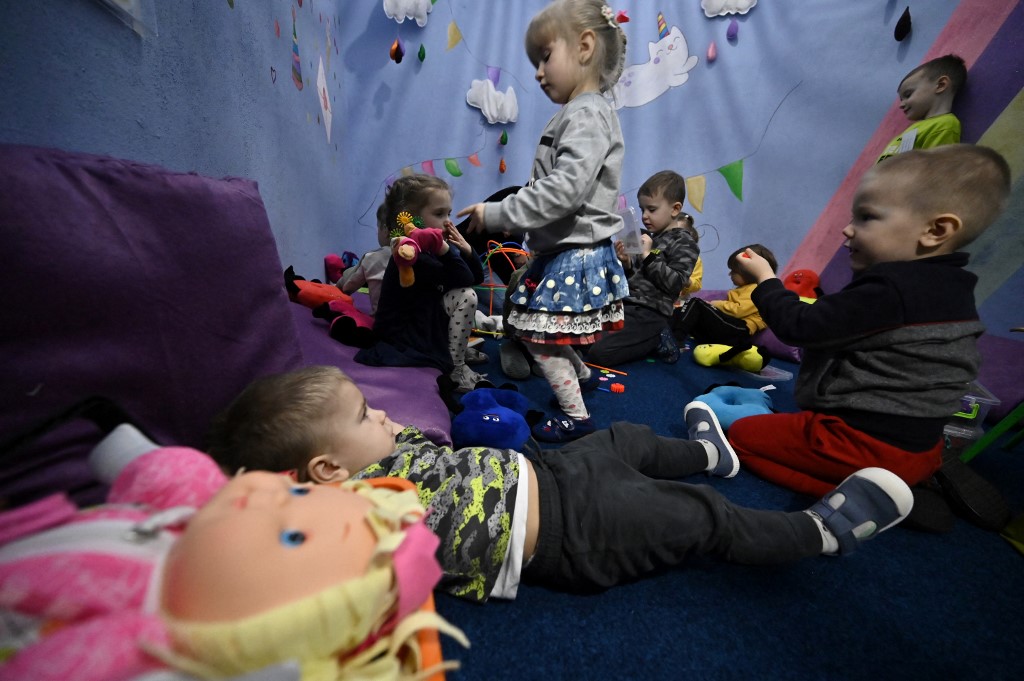 KYIV, Ukraine (AFP) — In the cellar of a Kyiv kindergarten decorated with bunting and wall paintings of doughnuts and cats, dozens of children are taking shelter during an air raid.