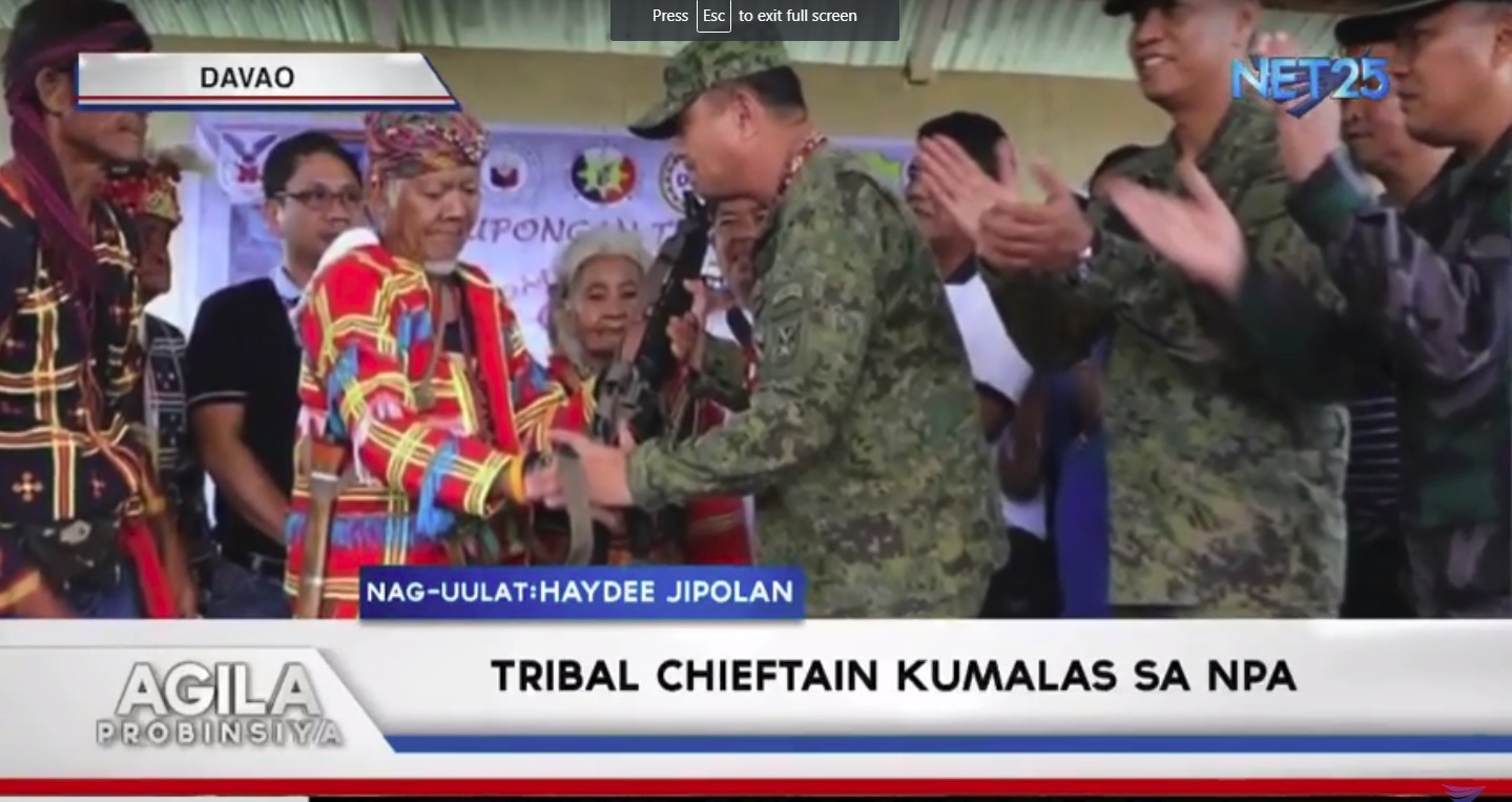 TALAINGOD, Davao del Norte (Eagle News) – Sumuko na ang founder at tribal chieftain ng “Salugpungan Tuno Igkatuno” at ang kaniyang mga subordinate leader sa unit ng 56th Infantry Battalion sa Talaingod, Davao del Norte.