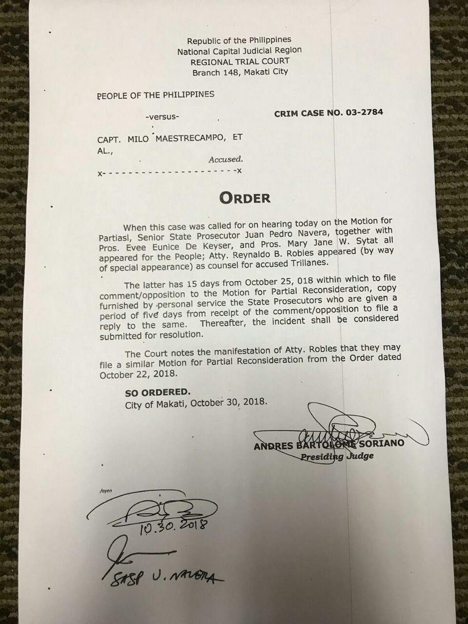 “The Court notes the manifestation of Atty. Robles that they may file a similar Motion for Partial Reconsideration from the Order dated October 22, 2018,” said the order of Makati RTC branch 148 presiding Judge Andres Bartolome Soriano