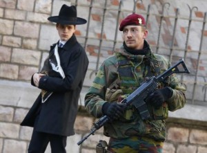 A Belgian paratrooper keeps guard outside a Jewish school in central city of Antwerp January 17, 2015. REUTERS/Yves Herman