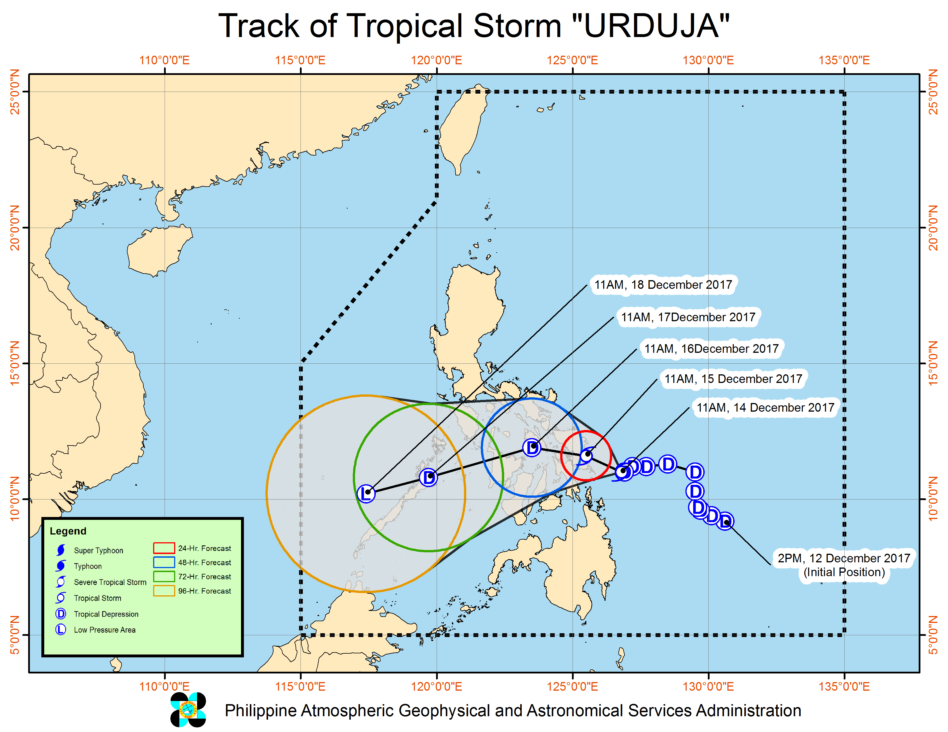 As of 10 a.m., Thursday (December 14), the center of tropical depression “Urduja” was estimated based on all available data at 120 kilometers east of Guian, Eastern Samar. It has maximum sustained winds of up to 60 kilometers per hour near the center and gustiness of up to 80 kph, and forecast to move west at seven kilometers per hour.
