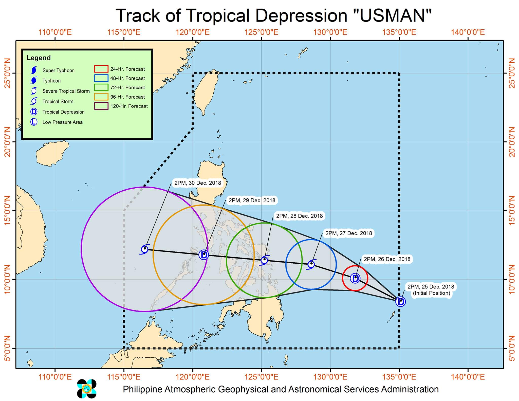 As of 4 p.m., the eye of “Usman” was located 945 kilometers east of Hinatuan, Surigao del Sur, packing maximum sustained winds of 45 kilometers per hour and gustiness of up to 60 kilometers per hour.