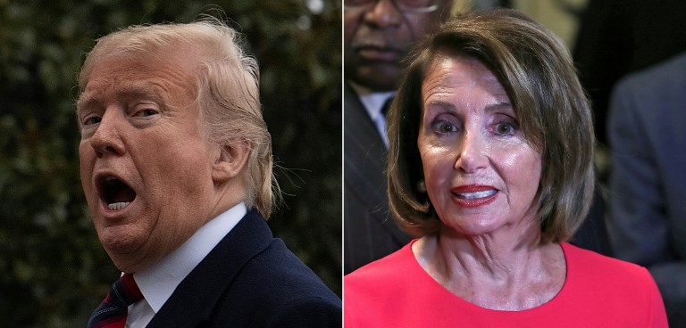 Speaker of the House Nancy Pelosi (D-NY) outside the House Chamber on Capitol Hill in Washington, DC on January 3, 2019. – US President Donald Trump bitterly attacked top Democrat Nancy Pelosi on January 20, 2019 after she rejected a deal on immigration and the Mexico border wall that would end a 30-day-old government shutdown. Pelosi, speaker of the House of Representatives, on January 19, 2019 called Trump’s offer of temporary protections for about a million immigrants in return for $5.7 billion to fund the wall a “non-starter.””Nancy Pelosi has behaved so irrationally & has gone so far to the left that she has now officially become a Radical Democrat,” Trump tweeted. “She is so petrified of the ‘lefties’ in her party that she has lost control.” (Photos by Jim WATSON and Alex Edelman / AFP)