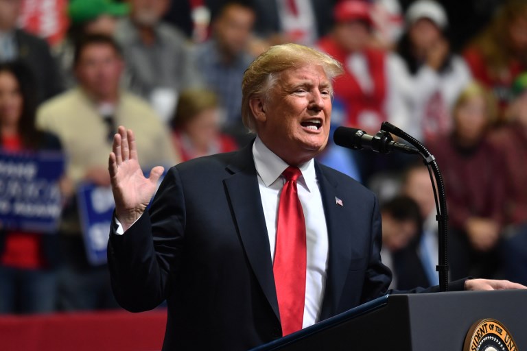 US President Donald Trump speaks during a “Make America Great Again” campaign rally at McKenzie Arena, in Chattanooga, Tennessee on November 4, 2018. (Photo by Nicholas Kamm / AFP)