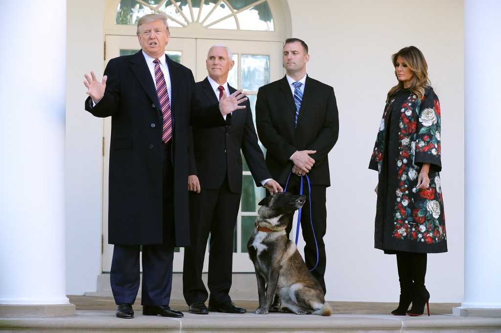 In a stream of superlatives, Donald Trump on Monday introduced to the world the military dog involved in the raid that led to the death of Islamic State group leader Abu Bakr al-Baghdadi.