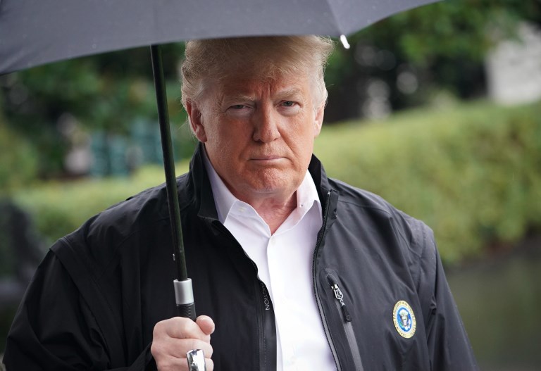 US President Donald Trump speaks before boarding Marine One from the South Lawn of the White House in Washington, DC on October 15, 2018. – Trump is heading to Florida after Hurricane Michael devastated the state. (Photo by MANDEL NGAN / AFP)
